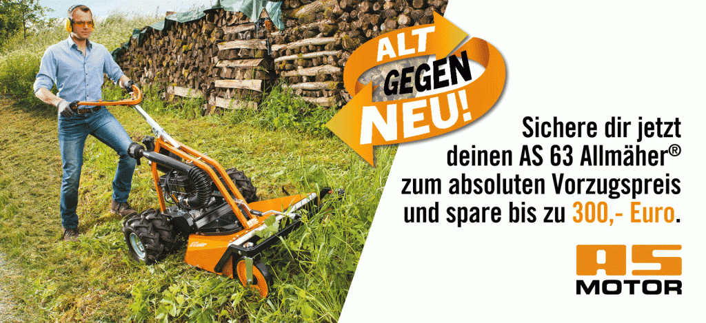 Geben Sie Ihren alten Hochgrasmäher eines beliebigen Herstellers bei Ihrem teilnehmenden AS-Motor Fachhändler in Deutschland ab. Im Gegenzug erhalten Sie im Zeitraum vom 1. März bis 31. Juli 2018 beim Kauf eines neuen AS 63 Allmäher® einen Preisnachlass von bis zu 300,- € auf den UVP.